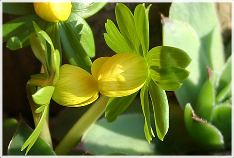 Det är inte bara alldeles intill huset, utan också ute i gräsmattan, vid kärleksörten och under träna på norrsidan, som vintern gäckas och blommar klargult. Inga mängder, en och annan.