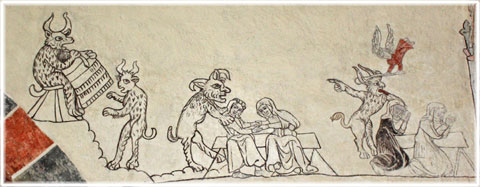 Medeltida målningarGotland | Guide Gotland | Utskrift | Mobilsida ![]() Målningarna i de medeltida kyrkorna är skatter. Lokala talanger likväl som enastående verk i Europa finns företrädda från olika århundraden i Gotlands kyrkor.Gotlands nästan 100 medeltida kyrkor är ofattbara skatter av konst och envishet. De riktiga konstkatterna hittar du på landet emedan Visby mestadels är ruiner, se 1525 - Vad hände egentligen, som t ex målningen ovan från Linde kyrka. Använd sökmotorn Först skall vi säga att man kan använda vår sökmotor på tre olika sätt för att söka: text och bild. Du kan byta ut sökordet om något annat intresserar.Vi har också delat in målningar och skulpturer i en Årtalshistoria för konst På det stora hela I Gotlands kyrkor finns målningar av alla sorter, slösande rikt, sparsamt, smakfullt och enormt dyrbara.Dessbättre är den medeltida konsten inte avsedd för framtida klassificeringsmästare och experter, utan den är avsedd för dig och mig; däremot kan det vara svårt för den sekulariserade nutiden att få kläm på allting. Under medeltiden var inte Gotland en förbisedd del av en större stat (se vägpriser) utan ön skötte sig själv, handeln var länge fri och Gotland var faktiskt en av de större handelsnationerna i Östersjöområdet. En gång i tiden var gutarna rika och hade råd. Passionsfriser på Gotland![]() När du besöker kyrkorna så är nog passionsfriser det vanligaste du kommer att få se, vilket beror på att påven i mitten av 1400-talet bestämde att så skulle det vara. De flesta passionsfriser är tämligen likadana och förmodligen gjorda efter någon sorts förlagor, men avvikelser förekommer, också häpnadsväckande sådana. Ålder på målningarna De äldsta målningarna hör 1100-talet till men de är rätt få ehuru somliga rent magnifika.Det förefaller mig som att under 1200-talet har konstnärer i större utsträckning än tillförne sökt en marknad på Gotland. Det känns som att konsten blir mera standardiserad men samtidigt förbättras tekniken. Gotland åker på en rejäl ekonomisk nedgång i mitten av 1300-talet som en följd av krig och Digerdöden. Också den konsten lider avbräck. Under 1400-talet kommer återigen en standardiseringsvåg, passionsfriserna, enligt påvens bestämmande. Men därefter händer inte så mycket, utom möjligen lite grann på 1600-talet då stormakten Danmark eller Sverige manifesterar sig också i kyrkorna. Olika stilriktningar Vi går inte in på hur olika stilriktningar inom den kyrkliga konsten såsom den byzantiska, romanska och gotikens konstsmak har påverkat måleriet. Det är alldeles för komplicerat. Och inte heller tycks det mig gå att använda ett årtal, dvs före detta år var konsten romansk osv, utan det förefaller som rena virrvarret, och inte heller kan man tidsbestämma all konst på ett begripligt sätt.Några exempel på medeltida målningar Det är ett alldeles för stort arbete att skapa en någorlunda vederhäftig guide för medeltida måleri på Gotland: det är alldeles för svårt och det finns alldeles för många åsikter i alldeles för många skrifter.Vi skall bara ge dig några fantastiska exempel och hoppas att du i stället tar dig tid att besöka kyrkorna för att avnjuta konsten (se kyrkguiden), ty det är utan vidare sant att under medeltiden var kyrkan den i särklass största beställaren av konst. Och: den medeltida konsten är inte avsedd för experter och kritiker utan för dig och mig! Dyrbaraste färgen![]() I Garde kyrka finns bl a bysantinska målningar från 1100-talet, se översikten. På relativt stora ytor har man målat med en blå färg som var lika dyr som guld; färgämnet kom från Afghanistan. De kunde alltså lika gärna ha målat med guld. I kyrkan finns originalmålningar utförda av mästare från den rysk-ortodoxa kyrkan, unika i Sverige, se Boris och Gleb. Den runda jorden![]() På altartavlan från 1300-talet i Lojsta kyrka håller Jesus ett jordklot i handen - runt och fint, se mer på sidan om Det medeltida världsalltet, där vi också visar den makalösa målningen från Eskelhem kyrka på den geocentriska världsbilden. SjälavägningDen till måttet största medeltida målningen är från 1200-talet och finns i Vamlingbo kyrka. Den visar vad som kallas kejsar Henriks själavägning. Och det är lätt att se att det inte längre är frågan om folkkonst med roliga tankar utan specialiserat måleri med hög teknisk kvalitet; särskilt ängels vingar är slående säger konstteoretiker. Målningen i Vamlingbo är störst och först men söker du på själavägning så får du fler exempel.Dessa själavägningar är också häftiga för de tillhör de äldsta exemplaren i världen på målningar föreställande detta - blott en målning i Rom sägs vara äldre. AngakodenHoppeligen känner du till den populära boken Da Vinci-koden, som i och för sig är spännande och rolig men proppad av historiska påhitt, ungefär som böckerna om Arn. Men när man ser den del av passionsfrisen i Anga kyrka som visar den sista måltiden blir man allt undrade, se Angakoden så förstår du.BrännmärktEtt exempel till från Anga får vi allt ta, se Den stekte Laurentius. Målningen är förresten en del av en själavägning. I Öja kyrka kan man förresten få ser hur det tog sig ut under själva stekningen, se Vänd på steken.HelvetesgapetJag vet inte hur många målningar det finns som också flitiga bibelläsare inte skulle känna till. På den här sidan från Ganthem kyrka med Helvetesgapet får du också ett exempel på att barn aldrig någonsin upphör att förvåna.Stora fötterIbland undrar man vilka tankar målaren har haft då det hela förfärdigats, se På Stora fötter i Ganthem. Det här med att gå på vatten kanske har en annan lösning än vad man tror.Historiska målningarVi vet ju inte om det är minnesvärda händelser som finns avbildade eller om det är scener från den omåttligt tjo