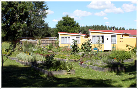 Framför vandrarhemsdelen har de en liten krydd- och grönsaksodling. Den sköts med omsorg och kärlek av en livs levande Trädgårdsälva, som så gott som bara pysslar med att ta hand om det hela. De andra som jobbar på Gula hönan säger att hon egentligen inte tycker om att dra upp växterna eftersom hon är vän med dem.