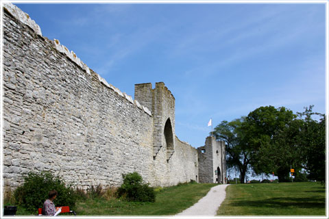 Söderport Ringmuren, Visby socken ![]() Vid Söderport har det alltid varit genomfartsled, också långt före såväl ringmur som torn. Tornet är byggt något senare än den tidigaste muren men innan den sista murförhöjningen gjordes i slutet av 1200-talet. Inne i portvalvet kan man se spår av den gamla porten och låsanordningarna. Den gamla porten som en gång hörde till tornet tjänade som tullanläggning ända in på 1800-talet; tullen är ett svenskt påhitt från 1600-talet. Tornet var betydligt bekvämare inrett än de andra. Här fanns inte bara en spis utan även en latrin och tornet hade alkover i väggarna. På muren, vid tornets utsida, finns det rester av en stentrappa som ledde från marken och upp i tornrummet. Strax på insidan av tornet börjar Södertorg, som vi ännu inte skrivit något särskilt om, men där har det hänt häftiga saker, se t ex Två hundra hästar med folk av bönderna. ![]() På ömse sidor av Söderport har tagits upp ett par extra portar för att underlätta kommunikationen som alltid har varit livlig, men dessa är av långt nyare datum än såväl torn som mur. ![]() Här har vi Söderport längst bort. Fotot är taget längs den södra delen av muren och min näsa pekar åt nordost. ![]() Om man står alldeles framför Söderport och tittar upp så är det en ganska mäktig syns. Det är ju inte Empire State building eller så, men om man bara har ett armborst så är utsikterna inte lysande. Skottgluggen är vidgad i förhållande till original, ty tiderna har ju så att säga växt från armborst till kanoner (jag skriver växt i stället för utveckling, för utveckling är det inte). /text och foto Bernt Enderborg Vägbeskrivning 0 |