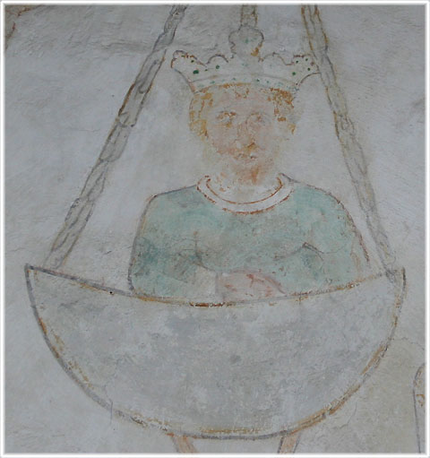 Blir man vägd där också![]() I Vamlingbo medeltida kyrka sitter denna figur i en vågskål och ser orolig ut. Han blir nämligen vägd av S:t Mikael, som väger själar. I den andra skålen läggs hans synder och annat varefter S:t Mikael ser var man bör tillbringa evigheten.